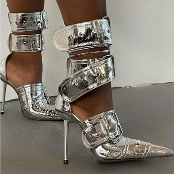 여성용 데님 메탈 리벳 버클 실버 샌들, 뾰족한 메탈 할로우, 섹시한 펑크 스타일, 12cm 하이힐, 사이즈 34-43