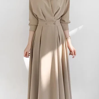 ChicAutumnVintage우아한 옷깃 퍼프 버튼 허리 장착 슬리밍 긴 소매 드레스 여성용 한국 스타일 가을 시즌