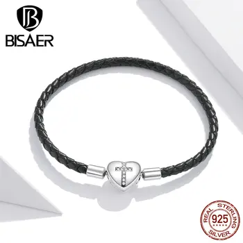 Bisaer 여성용 정통 925 스털링 실버, 모던 크로스 참 하트 팔찌, 오리지널 파인 주얼리, 연인 선물 ECB205